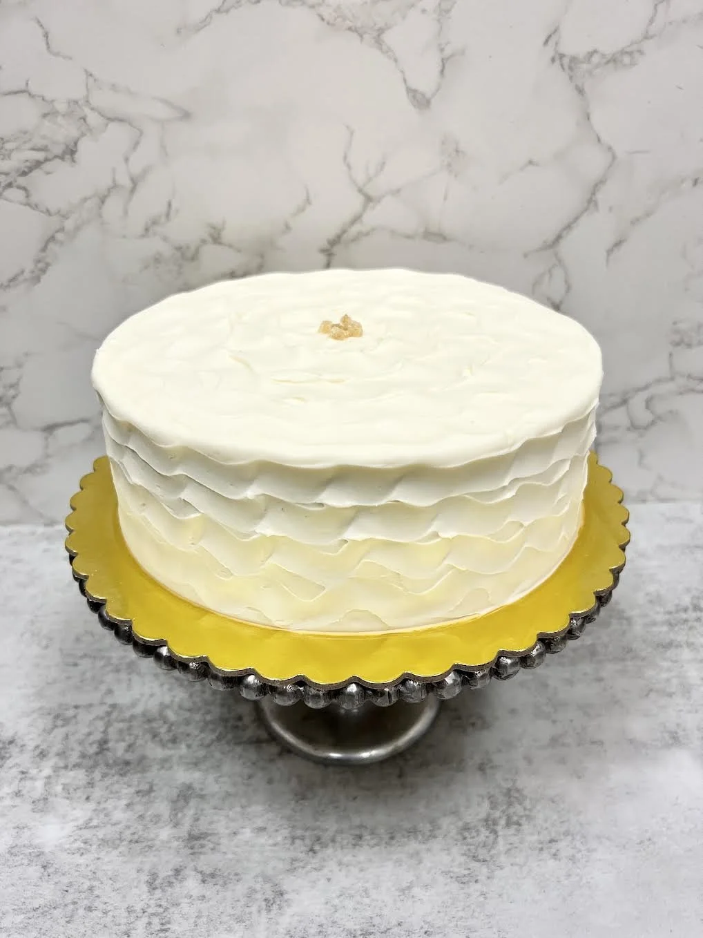 Two layers of lime-ginger spice cake frosted with cream cheese icing